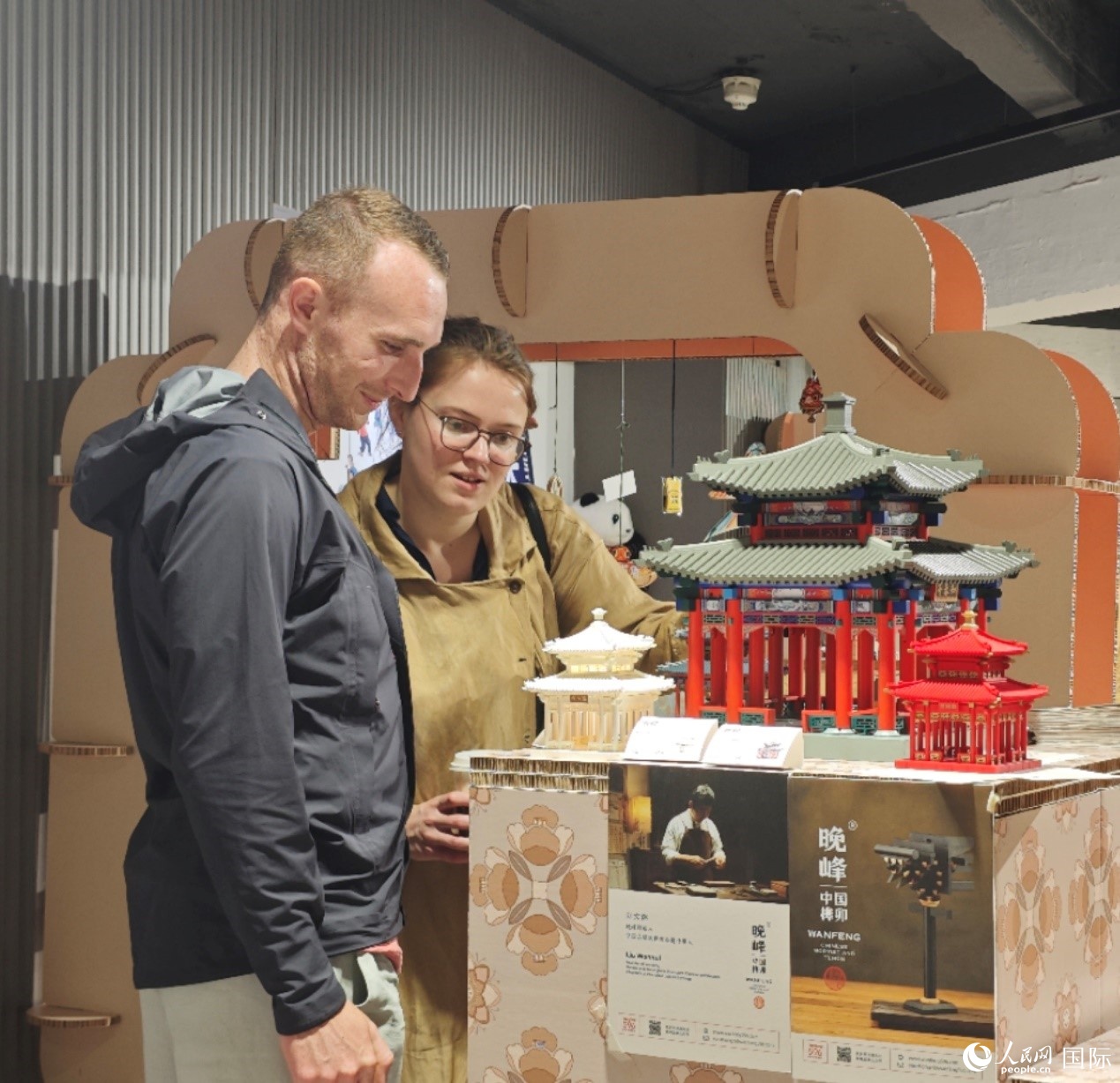 英國觀眾在欣賞中國傳統(tǒng)榫卯結(jié)構(gòu)建筑模型。人民網(wǎng)記者 邢雪攝