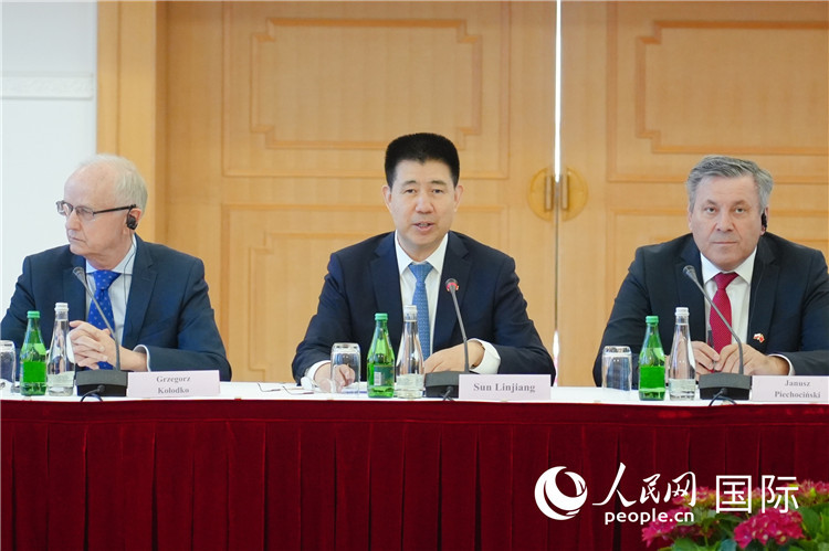 圖為中國(guó)駐波蘭大使孫霖江(中)在座談會(huì)上作主旨發(fā)言。人民網(wǎng)記者 李增偉攝