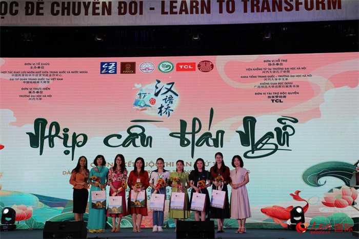 比賽現(xiàn)場,越方嘉賓為開展中文教育課程的越南高級中學(xué)代表獻(xiàn)花。人民網(wǎng)記者 楊曄攝