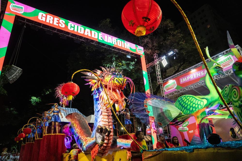 這是2024年2月14日凌晨在巴西貝洛奧里藏特拍攝的“城市花園”舞校的花車。表演主題為“穿越智慧之路 孔雀遇見龍——巴西-中國(guó)文化之旅”,慶祝巴中建交50周年并致敬中國(guó)龍年。新華社記者 王天聰 攝