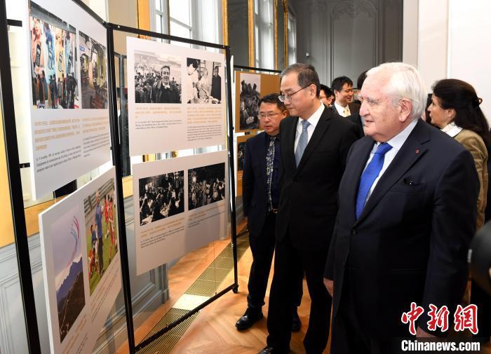 當(dāng)?shù)貢r間3月12日,中法建交主題圖片展在巴黎中國文化中心揭幕。圖為中國駐法國大使鄧勵、法國前總理拉法蘭等觀看展覽?!≈行律缬浾?李洋 攝