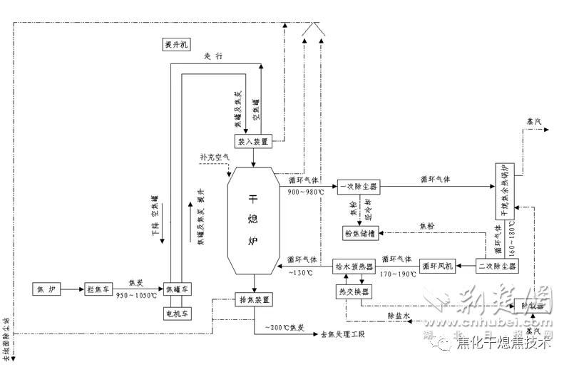 干熄焦,相對濕熄焦而言,是指采用惰性氣體將紅焦降溫冷卻的一種熄焦方法。在干熄焦過程中,紅焦從干熄爐頂部裝入,低溫惰性氣體由循環(huán)風(fēng)機鼓入干熄爐冷卻段紅焦層內(nèi),吸收紅焦顯熱,冷卻后的焦炭從干熄爐底部排出,從干熄爐環(huán)形煙道出來的高溫惰性氣體流經(jīng)干熄焦鍋爐進行熱交換,鍋爐產(chǎn)生蒸汽,冷卻后的惰性氣體由循環(huán)風(fēng)機重新鼓入干熄爐,惰性氣體在封閉的系統(tǒng)內(nèi)循環(huán)使用。該技術(shù)可節(jié)約用水、減少大氣污染物排放,回收大量紅焦顯熱并產(chǎn)生中高壓蒸汽,有效提高能源利用效率及焦炭質(zhì)量,擴大煉焦煤適應(yīng)性,降低煉鐵工序能耗,最終實現(xiàn)企業(yè)的節(jié)能減排。