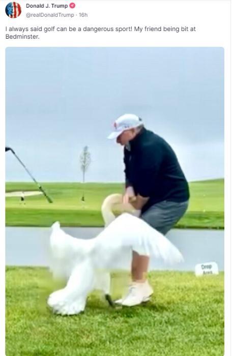 中新網(wǎng)5月26日電 據(jù)美國(guó)《野獸日?qǐng)?bào)》等外媒報(bào)道,當(dāng)?shù)貢r(shí)間25日,美國(guó)總統(tǒng)特朗普在社交媒體上曬圖稱(chēng),高爾夫是一項(xiàng)危險(xiǎn)的運(yùn)動(dòng),他的朋友被咬了。照片顯示,一個(gè)人在高爾夫球場(chǎng)上正在被天鵝/鵝攻擊。