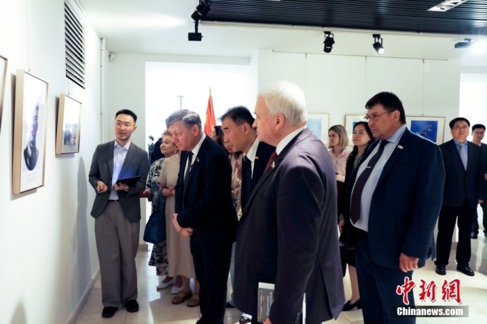 當(dāng)?shù)貢r(shí)間6月5日,紀(jì)念中國(guó)人民抗日戰(zhàn)爭(zhēng)暨世界反法西斯戰(zhàn)爭(zhēng)勝利80周年圖片展在莫斯科舉行。此次展覽共展出照片60幅,著重反映中國(guó)、蘇聯(lián)為世界反法西斯戰(zhàn)爭(zhēng)勝利作出的重要貢獻(xiàn),以及中俄兩國(guó)近年來在軍事、文化和人文等領(lǐng)域的交流與合作。圖為中俄嘉賓參觀圖片展。中新社記者 田冰 攝