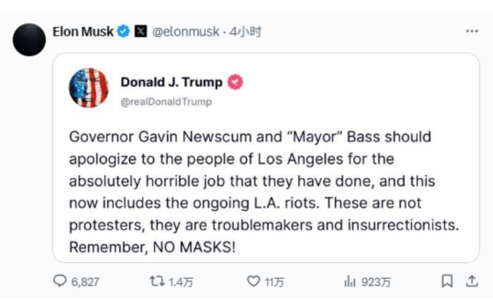隨后,馬斯克還轉(zhuǎn)發(fā)了多條特朗普在其自創(chuàng)社交平臺(tái)上發(fā)布的有關(guān)“洛杉磯騷亂”的帖文和截圖。有分析稱,這表示了馬斯克在該事件中對(duì)美國聯(lián)邦政府的聲援。