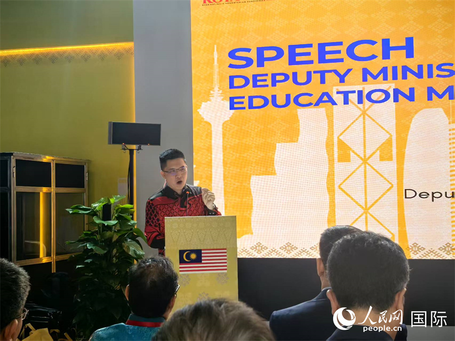 馬來(lái)西亞教育部副部長(zhǎng)黃家和在馬來(lái)西亞館揭幕儀式上發(fā)表講話。人民網(wǎng) 楊春燕攝