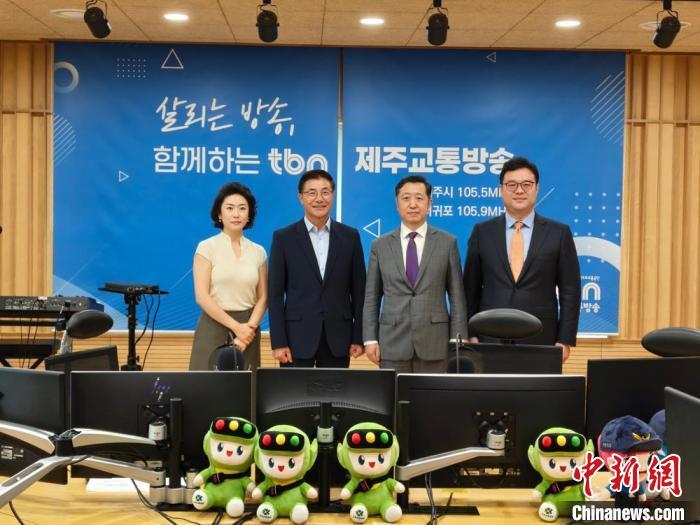 6月19日,中國(guó)駐濟(jì)州總領(lǐng)事陳建軍(右二)應(yīng)邀訪問(wèn)濟(jì)州廣播電臺(tái),同社長(zhǎng)玄炳柱(左二)座談交流,并一同見(jiàn)證《Tiki Taka,文化邂逅中國(guó)》節(jié)目首播。中國(guó)駐濟(jì)州總領(lǐng)事館 供圖