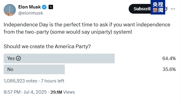 當?shù)貢r間7月4日,馬斯克再次在社交平臺上發(fā)布有關建立新黨派“美國黨”的投票。截至目前,已經(jīng)有超過108萬個賬號參與投票,其中64.4%選擇了“是”,35.6%選擇了“否”。