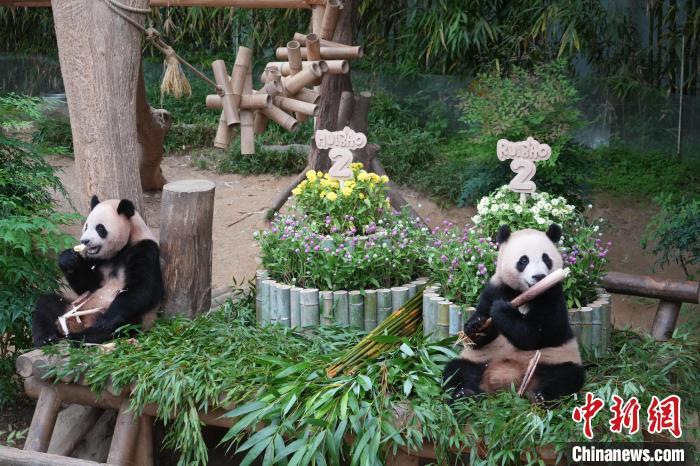 7月7日,在韓國(guó)誕生的雌性大熊貓雙胞胎“睿寶”和“輝寶”迎來(lái)兩周歲生日。韓國(guó)愛(ài)寶樂(lè)園為它們舉辦慶生活動(dòng)。圖為“睿寶”(左)和“輝寶”(右)在生日會(huì)上。中新社記者 劉旭 攝