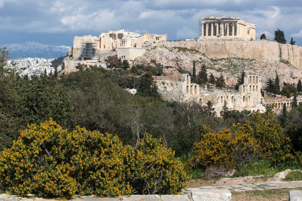 2022年3月14日,希臘雅典衛(wèi)城對面山坡上野花盛開。新華社發(fā)(馬里奧斯·羅洛斯攝)