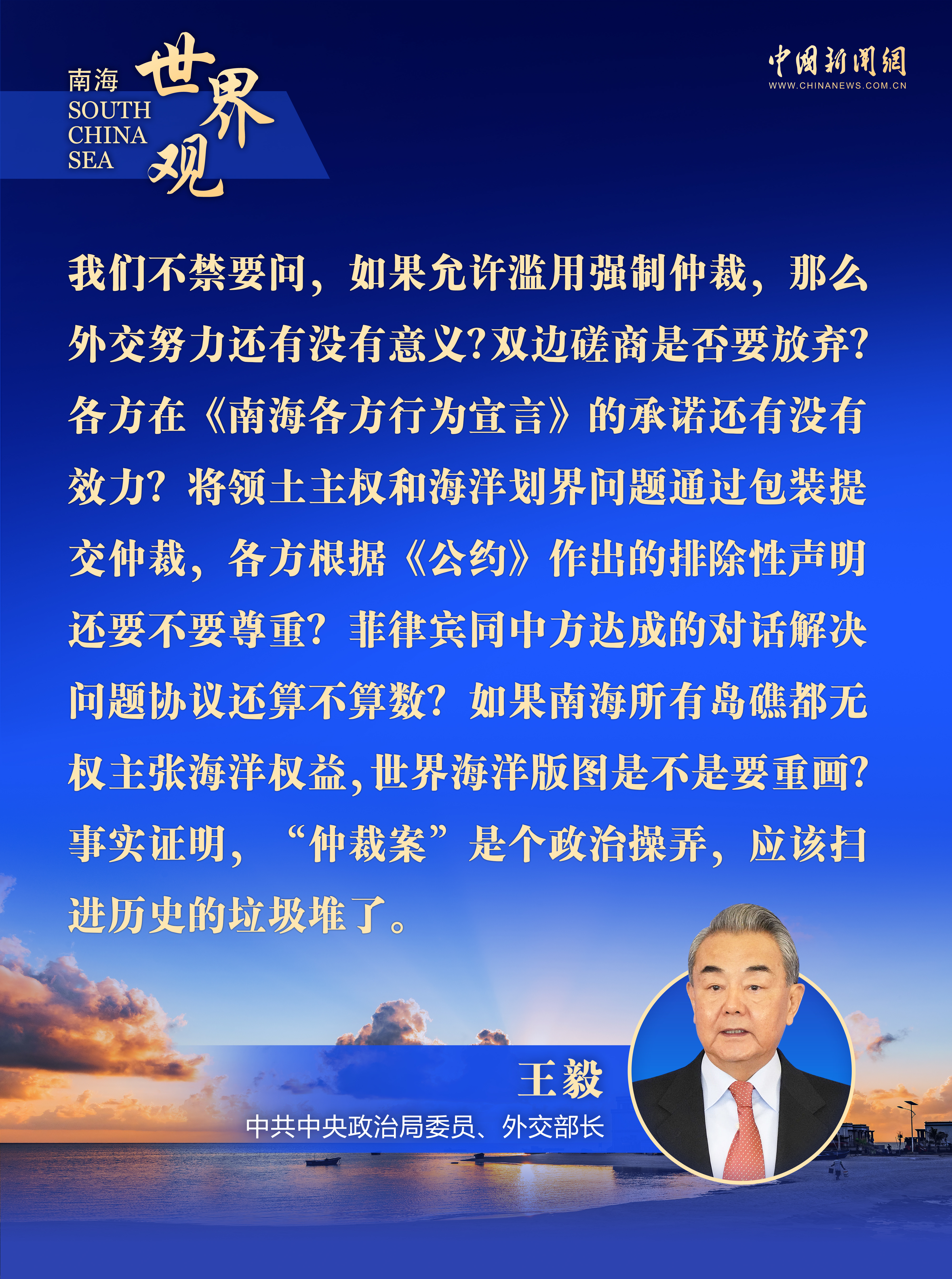 王毅還發(fā)出六連問,指出:如果允許濫用強制仲裁,那么外交努力還有沒有意義?雙邊磋商是否要放棄?各方在《南海各方行為宣言》的承諾還有沒有效力?將領土主權和海洋劃界問題通過包裝提交仲裁,各方根據(jù)《公約》作出的排除性聲明還要不要尊重?菲律賓同中方達成的對話解決問題協(xié)議還算不算數(shù)?如果南海所有島礁都無權主張海洋權益,世界海洋版圖是不是要重畫?