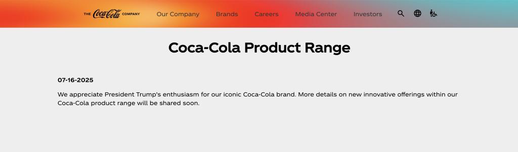 可口可樂公司同日在其官網(wǎng)上發(fā)表聲明說,感謝特朗普總統(tǒng)對其標(biāo)志性可口可樂品牌的熱情?!瓣P(guān)于可口可樂產(chǎn)品系列創(chuàng)新產(chǎn)品的更多細(xì)節(jié)將很快公布”。