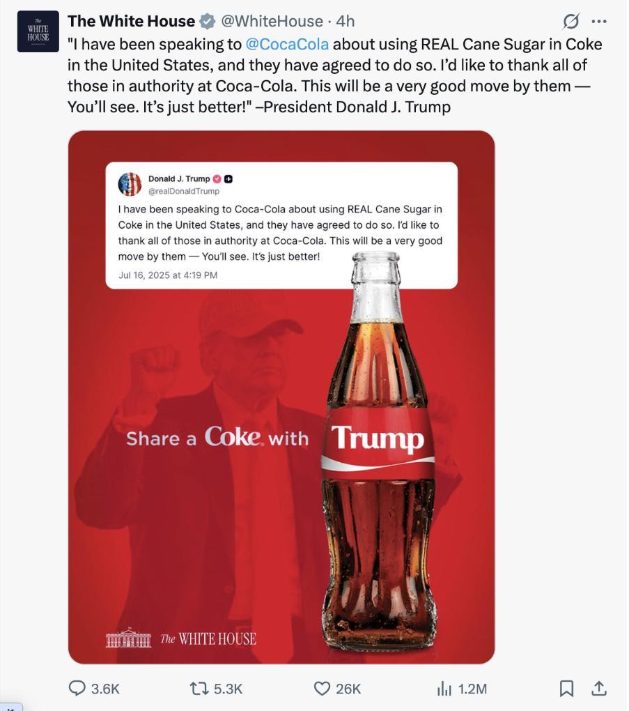 白宮社交媒體賬號轉(zhuǎn)發(fā)特朗普關(guān)于讓在美銷售可口可樂使用蔗糖帖文的截圖。