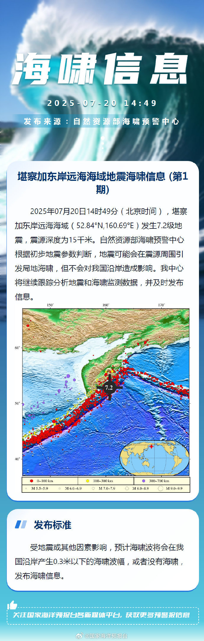 央視網消息:據國家海洋預報臺官方微博信息,2025年07月20日14時49分(北京時間),堪察加東岸遠海海域(52.84°N,160.69°E)發(fā)生7.2級地震,震源深度為15千米。自然資源部海嘯預警中心根據初步地震參數判斷,地震可能會在震源周圍引發(fā)局地海嘯,但不會對我國沿岸造成影響。中心將繼續(xù)跟蹤分析地震和海嘯監(jiān)測數據,并及時發(fā)布信息。