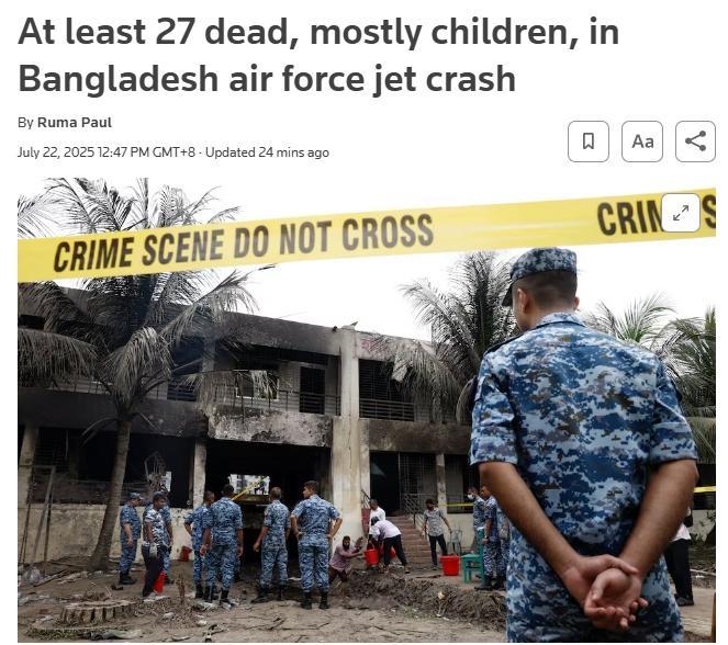 中新網(wǎng)7月22日電 據(jù)路透社消息,當(dāng)?shù)貢r(shí)間22日,孟加拉國(guó)官員表示,一架空軍訓(xùn)練機(jī)在當(dāng)?shù)貢r(shí)間21日于該國(guó)首都達(dá)卡墜毀并撞入一所學(xué)校校園,已確認(rèn)27人死亡,其中25人為兒童,另有88人入院治療。