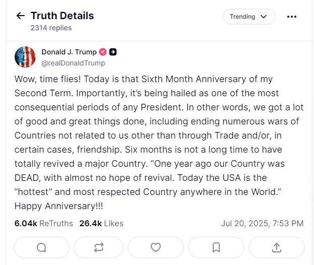 “哇,時(shí)間飛逝!今天是我第二個(gè)任期的半周年紀(jì)念日?!碧乩势諏?xiě)道,“重要的是,這段時(shí)間被認(rèn)為是歷任總統(tǒng)任期內(nèi)最具影響力的時(shí)期之一。換句話說(shuō),我們做了很多好事和大事,結(jié)束了多場(chǎng)與我們無(wú)關(guān)的國(guó)家的戰(zhàn)爭(zhēng)……”
