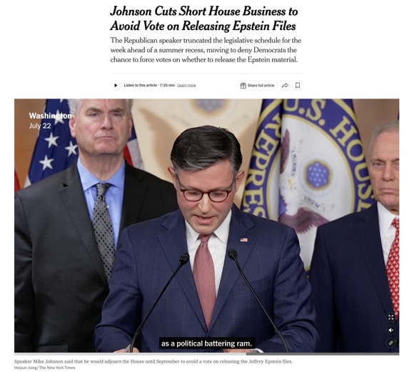 更引發(fā)關(guān)注的,是國會層面的程序性僵局。7月23日下午,眾議院突然宣布提前一天進(jìn)入夏季休會,但眾議院往年通常都是7月最后一周的周四或周五才休會,這立即引發(fā)了媒體對“規(guī)避投票”動機(jī)的質(zhì)疑。