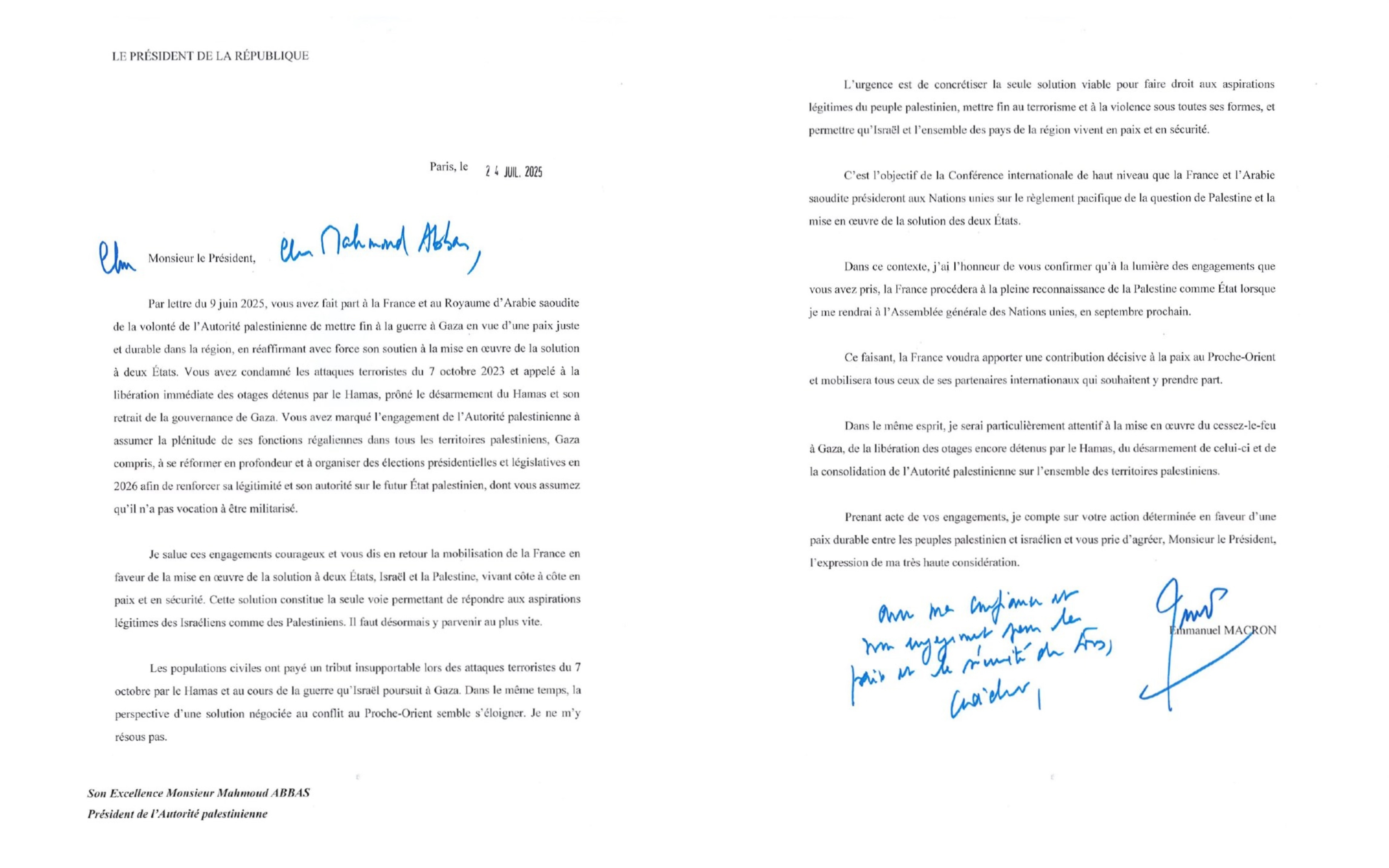 馬克龍還同時(shí)公開(kāi)了一封寫(xiě)給巴勒斯坦總統(tǒng)阿巴斯的正式信函,強(qiáng)調(diào)法國(guó)支持“兩國(guó)方案”,并肯定阿巴斯在推動(dòng)停火等方面作出的承諾。