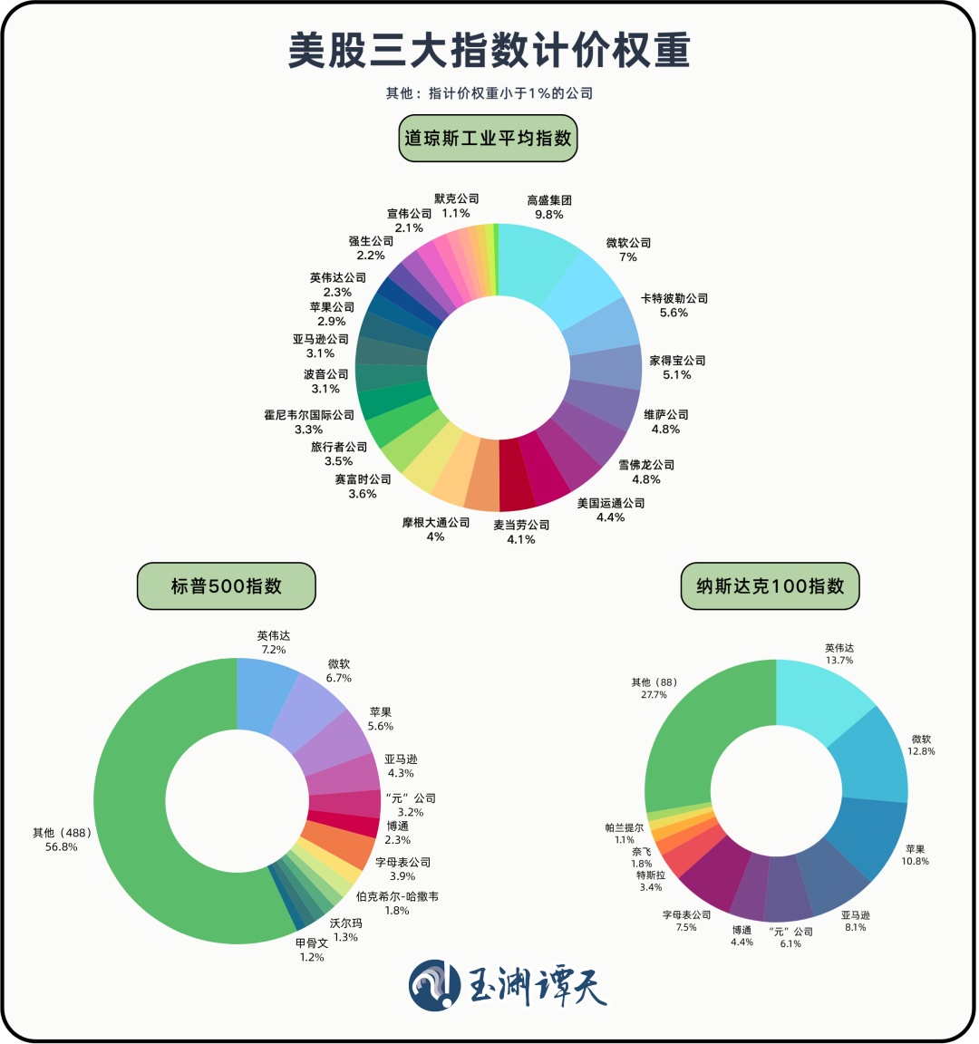 標普500和納斯達克采用“市值加權(quán)”,權(quán)重最大的是那幾個科技巨頭;而道指用的是“股價加權(quán)”,高價股走強,也能拉動整體指數(shù)。