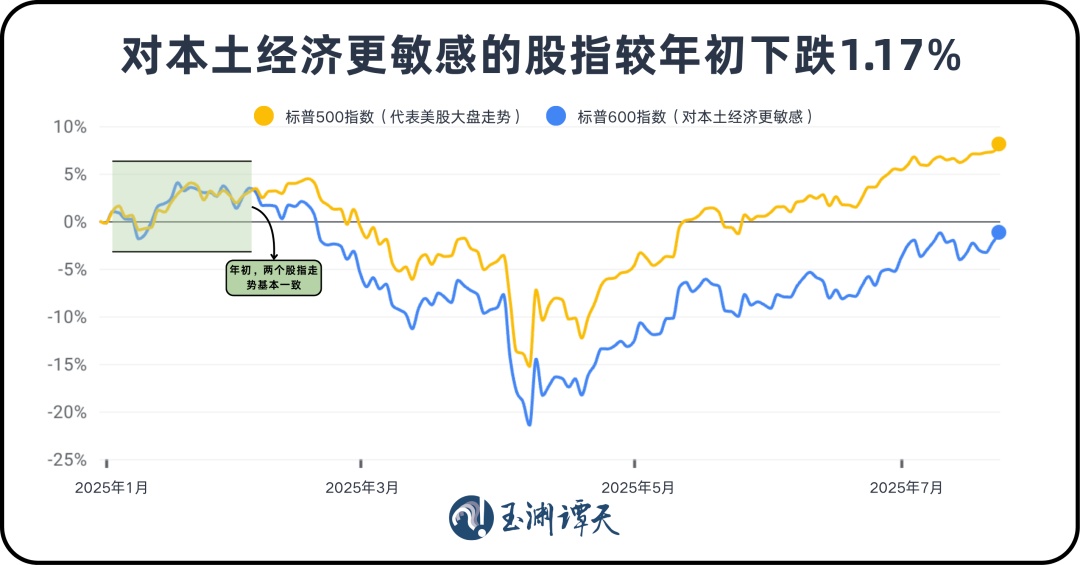 而對本土經(jīng)濟更敏感的標普600小盤股指數(shù),從年初到現(xiàn)在一直走弱,整體走勢遠不如大盤。