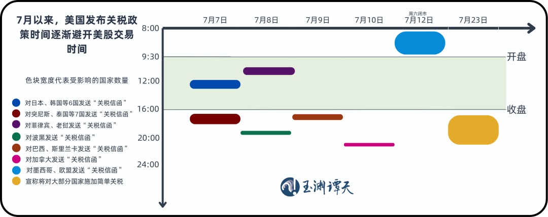 或許也正是因為關(guān)稅政策對美國自身的沖擊要更大,美國政府在前兩日公布關(guān)稅信函之后,后面再發(fā)布關(guān)稅相關(guān)政策時,都刻意避開了美股的交易時間段。