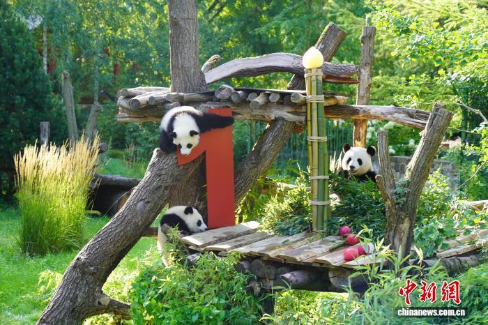 當(dāng)?shù)貢r(shí)間8月22日,旅德大熊貓雙胞胎“夢(mèng)好”和“夢(mèng)甜”在柏林動(dòng)物園歡度一周歲生日。圖為“夢(mèng)好”和“夢(mèng)甜”在媽媽“夢(mèng)夢(mèng)”(右一)陪伴下玩耍。中新社記者 馬秀秀 攝