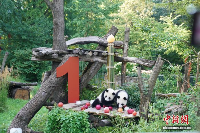這對(duì)大熊貓雙胞胎是旅德大熊貓“夢(mèng)夢(mèng)”于2024年8月22日誕下的一對(duì)雌性雙胞胎。這是德國(guó)第二次迎來(lái)大熊貓誕生。它們?cè)趹c生活動(dòng)中調(diào)皮地爬上竹子蠟燭,不時(shí)舔著冰彈珠,還在攀爬架上你追我趕,玩得不亦樂(lè)乎。