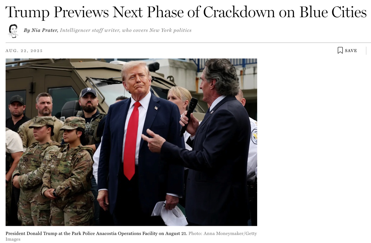 同時,特朗普點名華盛頓、芝加哥、紐約這類由民主黨主政的大城市,意在放大“民主黨治理失敗”的印象。芝加哥常被貼上“槍支暴力與治安崩壞”的標簽,紐約既是特朗普的故鄉(xiāng),也是民主黨與主流媒體的象征性舞臺。這些選擇既有象征意義,也能放大政治對比,強化“只有我能恢復秩序”的選戰(zhàn)話語。