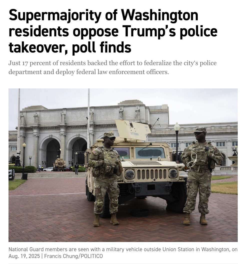 △美國“政治”網(wǎng)站報道,79%的華盛頓特區(qū)居民反對聯(lián)邦接管特區(qū)警務并部署國民警衛(wèi)隊的做法。