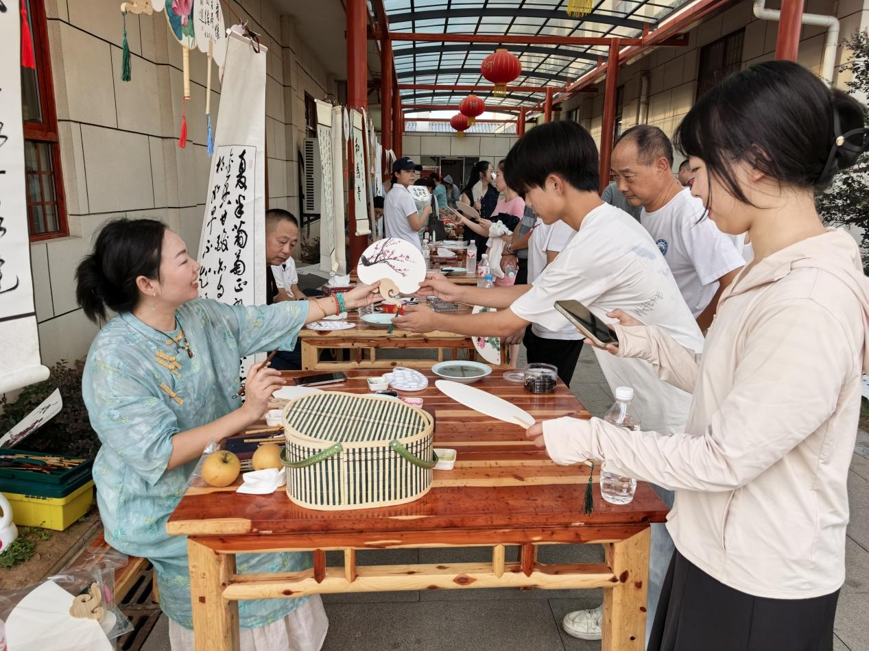 采摘季的熱鬧,不止在葡萄架下。園區(qū)內(nèi)的文化活動(dòng)區(qū),扇子繪畫(huà)與書(shū)法桌前圍滿了人。老師們凝神揮毫,有的在扇面勾勒黛色遠(yuǎn)山、粉紅梅花,有的書(shū)寫(xiě)“喜樂(lè)安康”“清風(fēng)徐來(lái)”,圍觀群眾有序排隊(duì),盼著領(lǐng)走專(zhuān)屬自己的“文化伴手禮”。