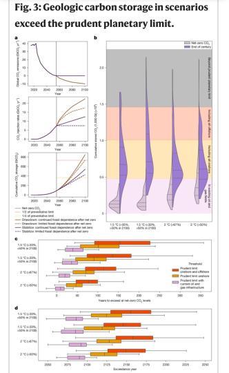 在本項(xiàng)研究中,論文第一作者和通訊作者、奧地利國(guó)際應(yīng)用系統(tǒng)分析研究所Matthew J. Gidden與同事及英國(guó)、法國(guó)、德國(guó)等合作者一起,在分析穩(wěn)定地質(zhì)構(gòu)造的同時(shí)考慮到環(huán)境敏感地點(diǎn)、與人口中心的距離,以及缺乏政府支持這類風(fēng)險(xiǎn)因素,從而量化了地球?qū)嶋H能支持的地質(zhì)碳儲(chǔ)量。他們研究發(fā)現(xiàn),這種更謹(jǐn)慎的估算得出的地球二氧化碳地質(zhì)封存潛力為1.46萬(wàn)億噸,而且這一潛力可能在2200年被用盡。
