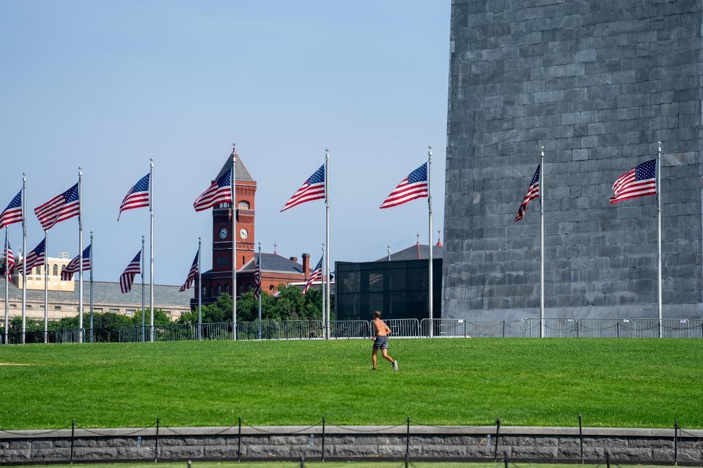 6月23日,在美國(guó)首都華盛頓,一名男子在草地上跑步。新華社記者胡友松攝