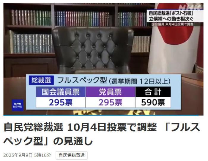 報(bào)道稱,自民黨將于9月9日敲定總裁選舉的日程和形式,預(yù)計(jì)9月22日發(fā)布公告,10月4日進(jìn)行自民黨籍國會(huì)議員投票。