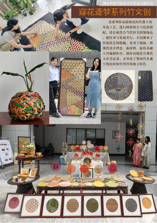 跨專業(yè)團隊覆蓋設(shè)計、教育、傳播等領(lǐng)域,形成研發(fā)-推廣-銷售全鏈條。近年獲7項國家級/省級創(chuàng)業(yè)項目、17項專利、50余項學(xué)科競賽獎,2023年入選教育部傳統(tǒng)文化宣傳項目,2024年斬獲湖北省大學(xué)生藝術(shù)節(jié)二等獎并亮相開幕展演,現(xiàn)場打造的“湖科大藝圓”竹編裝置獲專家贊譽。