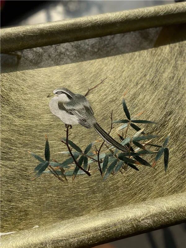 2019年,劉小紅創(chuàng)新研發(fā)“云絲紙刺繡”項目。材質(zhì)上,選用纖維絲壓制的云絲紙作底料,這種紙張紋理稀薄無序、疏密不均,在常規(guī)刺繡中難以固定針腳,本不適用于繡制。針法上,針對云絲紙?zhí)匦?,采用“搭橋牽線”復(fù)合手法:先以“線中生線”的方式在紙材稀薄處用長針固定,再以“針中套針”的技法在紙材密實處維穩(wěn);表現(xiàn)層面,則依據(jù)圖案需求,通過絲線分絲的粗細(xì)變化與顏色疊變呈現(xiàn)質(zhì)感,最終讓作品與云絲紙的特質(zhì)完美融合,呈現(xiàn)出精妙絕倫的藝術(shù)效果。