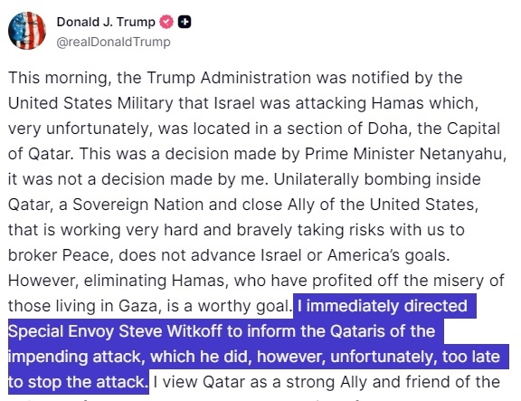 9日,美國總統(tǒng)特朗普在其社交平臺“真實(shí)社交”發(fā)文稱,當(dāng)天上午,政府接到美軍通知,以色列正在對位于多哈某區(qū)域的哈馬斯目標(biāo)實(shí)施襲擊。特朗普稱,襲擊是以總理內(nèi)塔尼亞胡單方面的決定,而不是他的決定。特朗普稱,他當(dāng)時(shí)“立即指示特使威特科夫向卡塔爾通報(bào)即將發(fā)生的襲擊”。襲擊發(fā)生后,他與卡塔爾埃米爾(國家元首)及首相通話,保證此類事件不會在其領(lǐng)土重演。他還已指示國務(wù)卿魯比奧盡快完成與卡塔爾的防務(wù)合作協(xié)議。