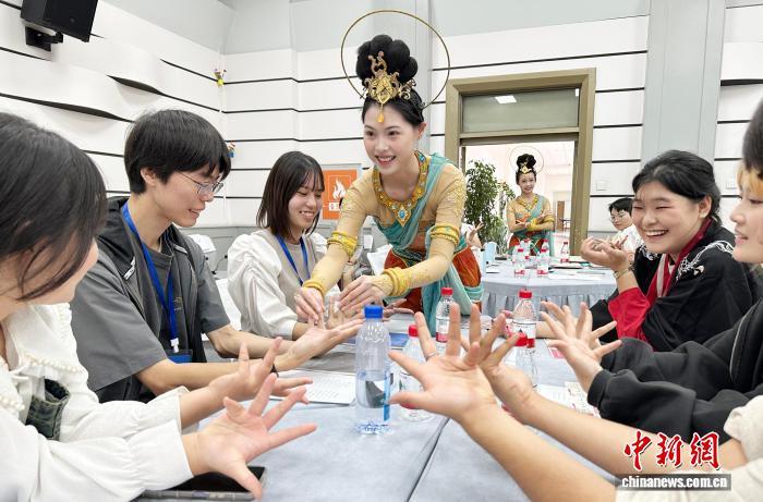 9月9日,日本秋田縣大學(xué)生代表團(tuán)與西北師范大學(xué)學(xué)生進(jìn)行交流互動(dòng),學(xué)習(xí)敦煌舞手勢(shì)動(dòng)作。中新社記者 丁思 攝