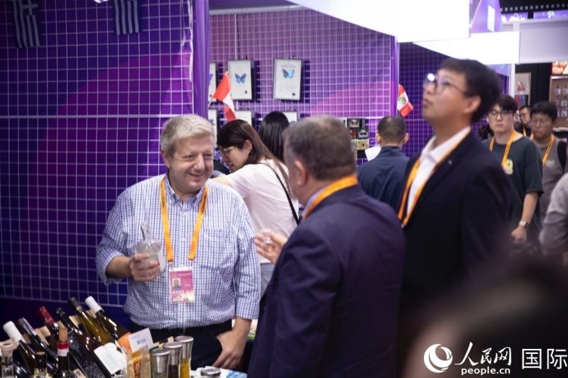 | 希臘共和國駐華大使館展區(qū)工作人員正在向游客介紹特色酒類產品。人民網 李澤攝 |