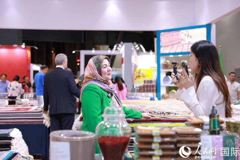 | 伊朗伊斯蘭共和國展區(qū)工作人員正在接受采訪,介紹產品。人民網記者 賈文婷攝 |