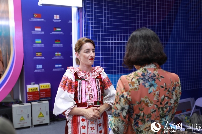 | 斯洛伐克共和國駐華大使館展區(qū)工作人員正在接受記者采訪。人民網記者 賈文婷攝 |
