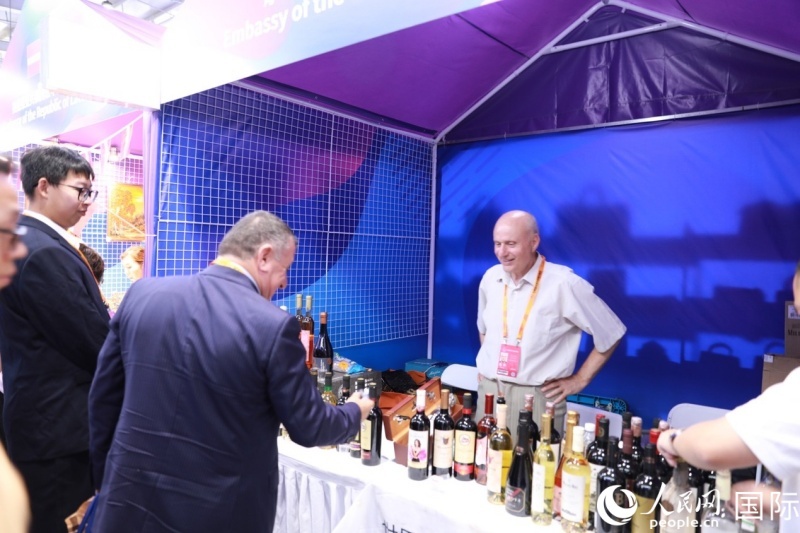 | 游客正在摩爾多瓦共和國駐華大使館展區(qū)了解酒類展品。人民網記者 賈文婷攝 |
