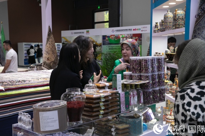 | 游客正在伊朗伊斯蘭共和國展區(qū)了解產品細節(jié)。人民網 李澤攝 |