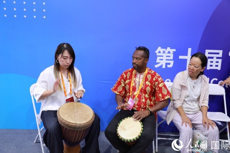 | 馬里共和國駐華大使館展區(qū)工作人員正在教游客表演非洲鼓。人民網記者 賈文婷攝 |