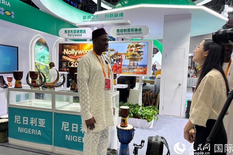 | 尼日利亞聯(lián)邦共和國展區(qū)工作人員正在與記者交談。人民網 高文瀟攝 |