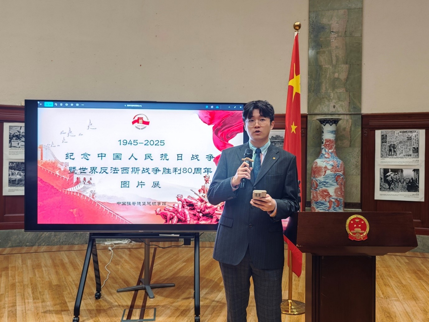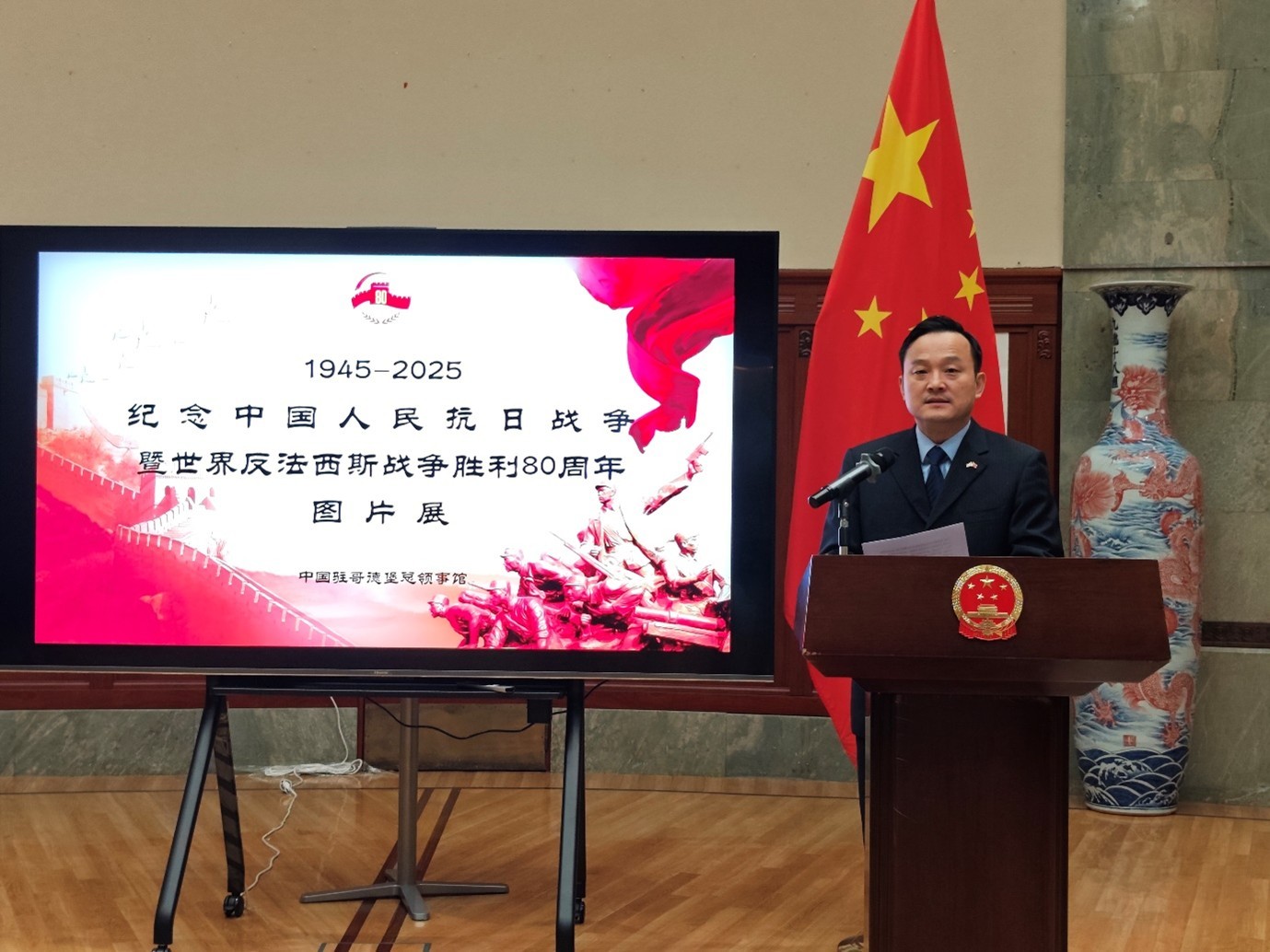 人民網(wǎng)斯德哥爾摩9月12日電 (記者殷淼)9月12日,中國駐哥德堡總領館隆重舉辦紀念中國人民抗日戰(zhàn)爭暨世界反法西斯戰(zhàn)爭勝利80周年圖片展和招待會。領區(qū)僑胞、留學生和社會各界人士300余人出席,中國駐哥德堡總領事楊培棟現(xiàn)場致辭。