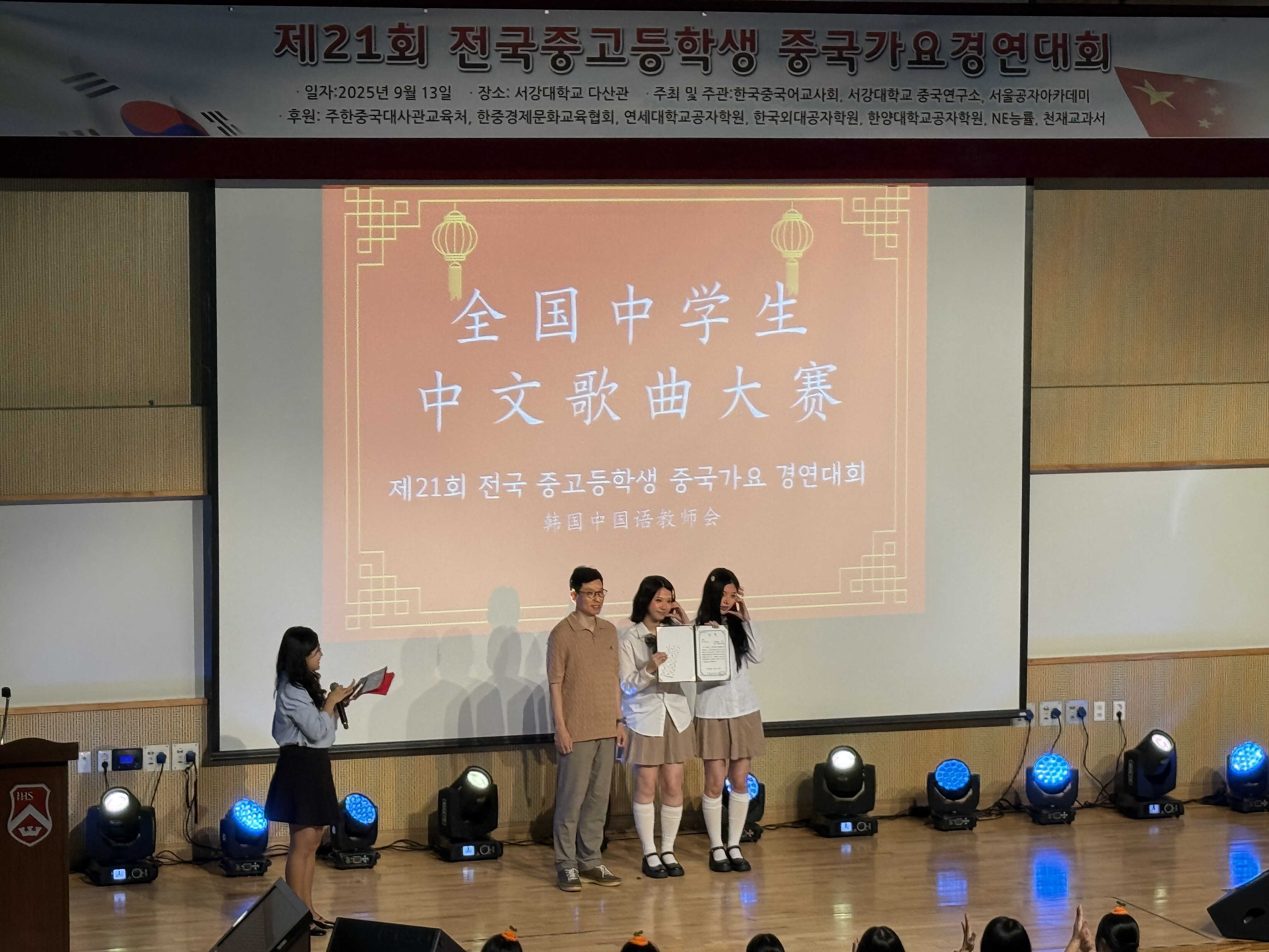 人民網(wǎng)首爾9月14日電 (記者莽九晨)13日,由韓國中國語教師會、首爾孔子學(xué)院和西江大學(xué)中國研究所共同舉辦的“第21屆全國中學(xué)生中文歌曲大賽”在韓國西江大學(xué)舉行。