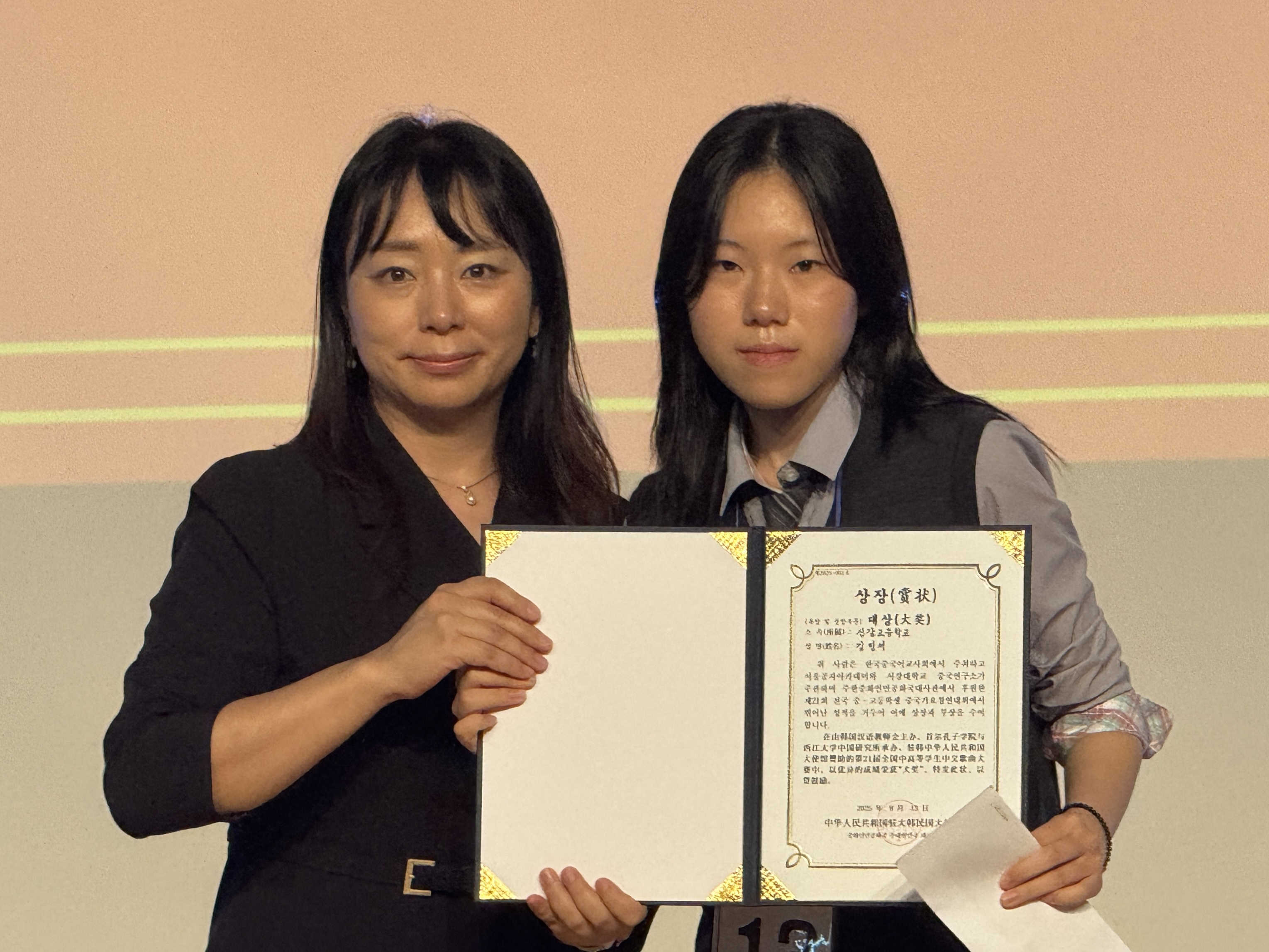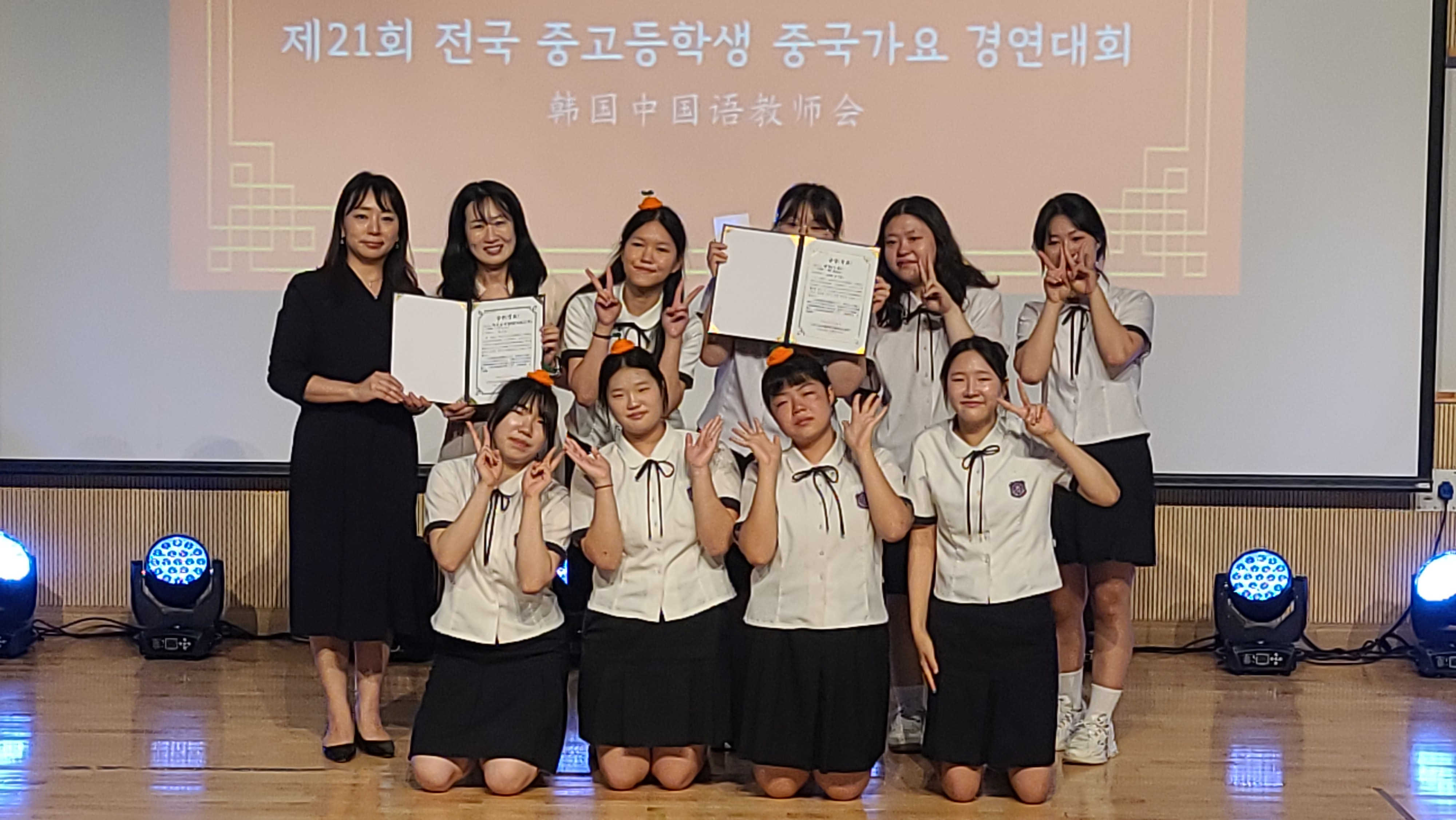 | 13日,“第21屆全國中學(xué)生中文歌曲大賽”在韓國舉行。圖為獲獎選手與頒獎嘉賓合影。韓國中國語教師會供圖 |