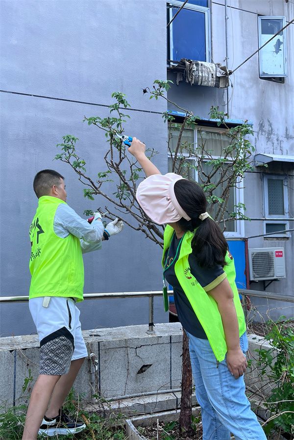 西廠口社區(qū)園藝師張巍和徐家棚街道徐東路社區(qū)龔吉條默契配合修剪月季枝條。 通訊員供圖