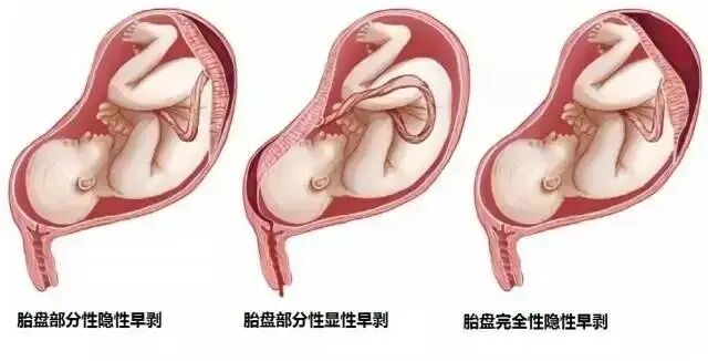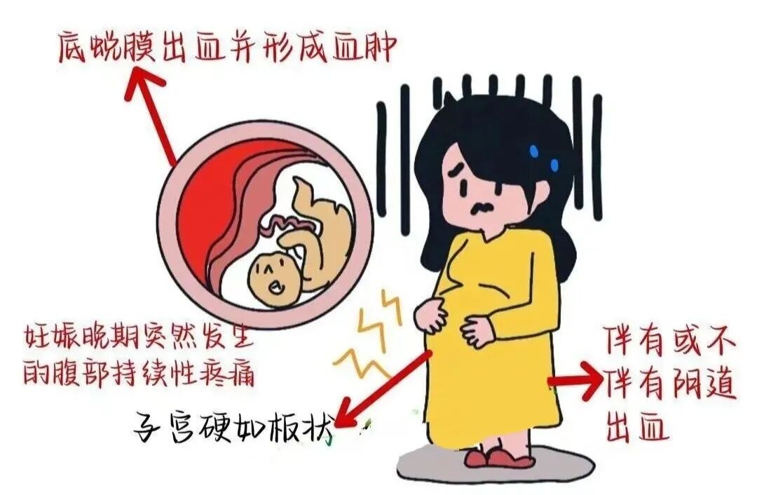 典型癥狀:妊娠晚期突發(fā)持續(xù)性腹痛,伴或不伴陰道流血,疼痛程度與剝離面積、內(nèi)出血量成正比,剝離面積越大、內(nèi)出血越多,腹痛越劇烈。