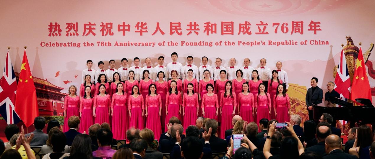 使館合唱團(tuán)以及倫敦華人愛樂合唱團(tuán)聯(lián)袂獻(xiàn)曲迎國慶。楊浩鵬攝